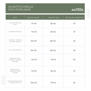Le tableau détaillant les quantités d’argile et d’eau à appliquer selon les zones sera également à votre disposition, pour garantir des dosages précis et optimaux.